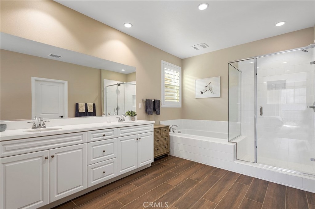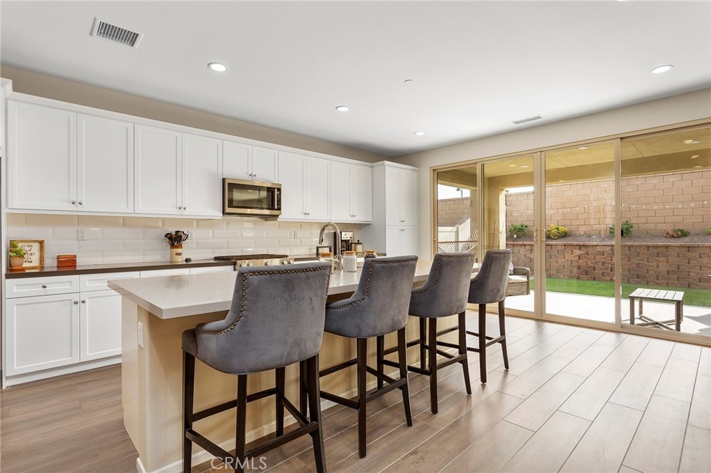 Practically perfect cul de sac home! Not a detail was missed in this stunning single-story in the amenity-rich community of Spencer’s Crossing! This 4-bed, 2 ½ bath home sits at just over 3200 sqft and is upgraded through and through! The beautiful entryway immediately boasts wood-like tile flooring, which is found throughout most of the home, and an open-concept feel carries into the dining, kitchen, and family rooms. The unique kitchen plan not only features sparkling stainless steel and custom tile backsplash, but also has a separate peninsula style bar, showcasing a built-in wine cooler, and is an amazing space for entertaining! A private hall towards the entrance of the home features a spacious powder room, and leads to three sizeable bedrooms, each with their own walk-in closets, and one full size bathroom. Another hall off the family room guides you to the master suite, which has a massive walk-in closet and luxurious 5-piece bath. Oversized double-sliding patio doors lead to the sweet and relaxing California room! The backyard is pristine and low maintenance, and such an amazing extension of the home! This home also features a 3-car tandem garage, huge laundry/mudroom, and tons of built-in storage space! It resides in the award-winning Murrieta School district, is close to the community parks, clubhouse and pools, a short drive to Temecula wineries, and only a few short miles from the 215 fwy.